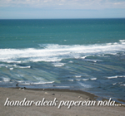 Zarrastatu dut puska bat paper zuri. Marraztu dut zentimetro baten luzera duen marratxoa errotuladorez, urdin eta mehe, zuzen eta horizontal, odaiertza eredu. Eskuinetik ezkerrera egin dut, ohi dudan bezala. Egiaztatu dut nire zentimetroak, kontrako norantzan egina izanagatik ere, zentimetro bat neurtzen duela. Lurperatu dut hatz erakuslea hondarrean eta, behin jasota, astintzen hasi naiz itsatsi zaizkidan hondar-aleak. Euria ari du paper zuriaren gainean...